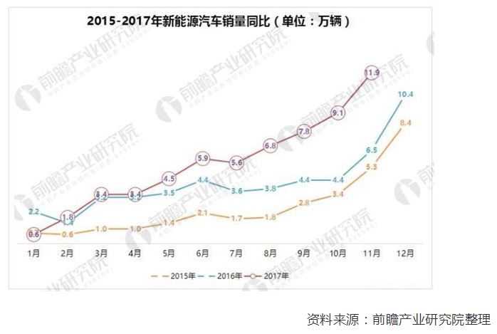 從產(chǎn)銷規(guī)模來看,我國新能源汽車在全球市場的比重已超過50%;據(jù)前瞻產(chǎn)業(yè)研究院統(tǒng)計數(shù)據(jù)顯示,2017年1-11月,新能源汽車產(chǎn)銷分別完成63.9萬輛和60.9萬輛,同比分別增長49.7%和51.4%。保守估計,今年中國新能源汽車的產(chǎn)銷會達到70萬輛左右,截止2017年保有量將會突破170萬輛左右。
